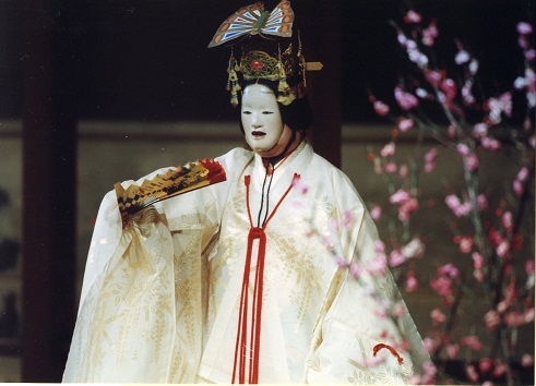 | そこで僧が花の下で休んでいると、美しい胡蝶の精霊が現れて法華経の功力で梅の花に縁を持てた事を喜びます。そして梅花に戯れ、舞い遊んでいましたが、やがて胡蝶は暁の雲の霞に紛れて消えていくのでした。 | |