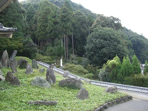| 宝物館がる松風苑のお庭です。向こうに見える山が、松尾山。 | ここが、松尾山への入口。許可がないと入れませんし、入山するにはお払いを受けなければいけません。 この山の渓谷の北にある谷が大杉谷といわれ、 その頂上近くに巨大な岩石があります。 これが古代の磐座(いわくら)で、本殿が出来る前まで松尾社の神を祀っていた所です。 |