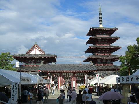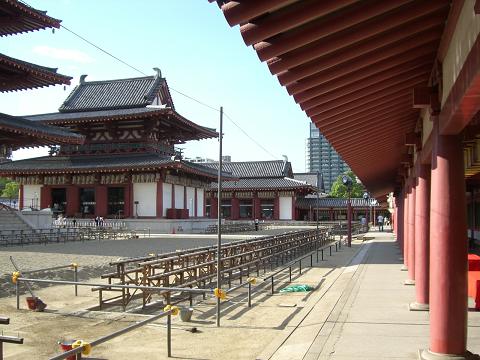 | 「金堂のご本尊は。如意輪輪の仏像。救世観音とも申すとか」これもl、「弱法師」の謡の一部分。ここが金堂で、中のご本尊は「救世観音様」です。上の写真の左の建物です。ご本尊さまは、とっても綺麗なお顔をされてました。 | 一番左に見える屋根が「五重塔」。次の建物が「金堂」。その向こうが「講堂」。右に見える柱が「回廊」。これが「四天王寺式伽藍」です。 | |
